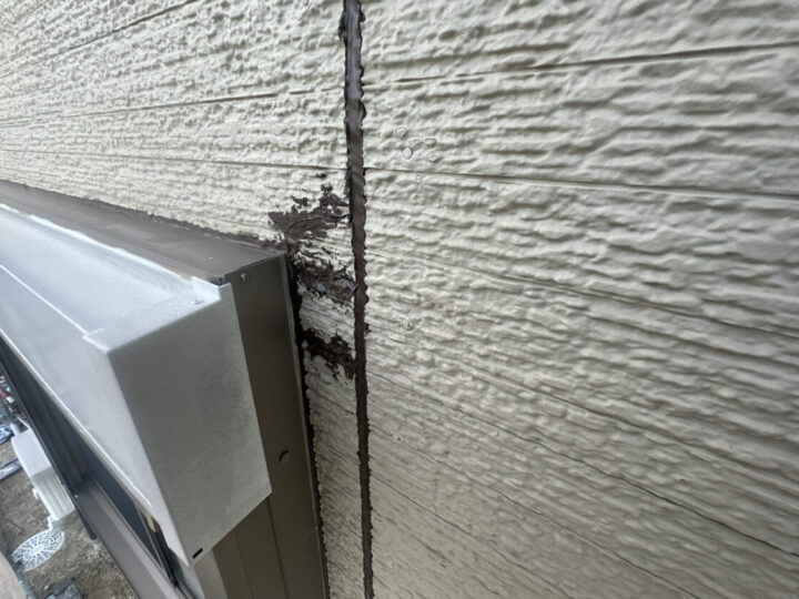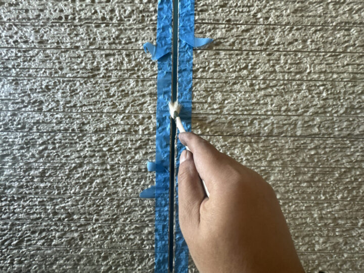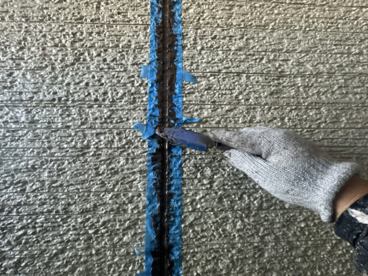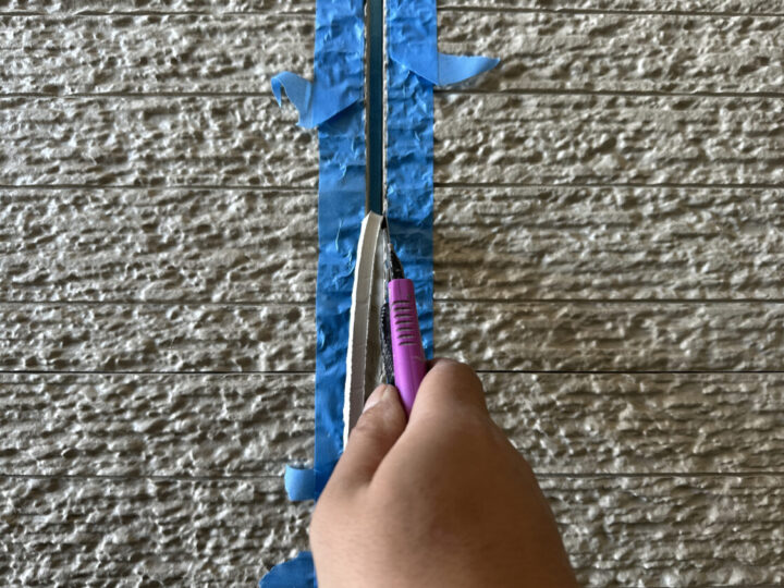 縦目地は打ち換えなので既存のシーリングをカッターなどで切りながら撤去いていきます。