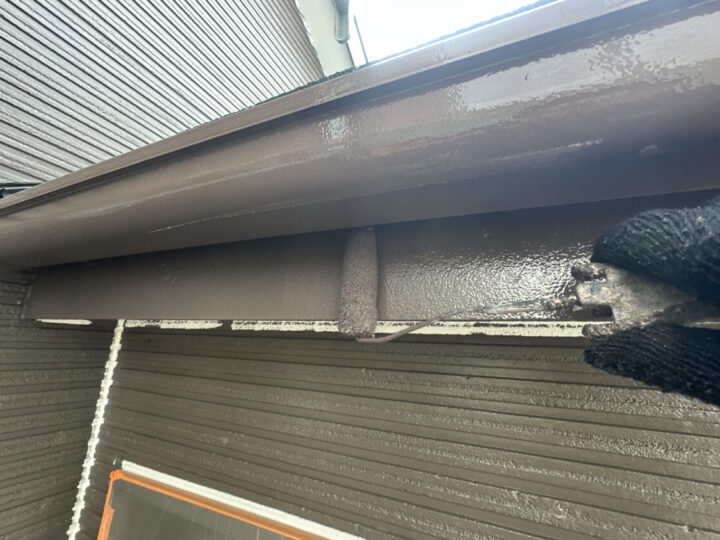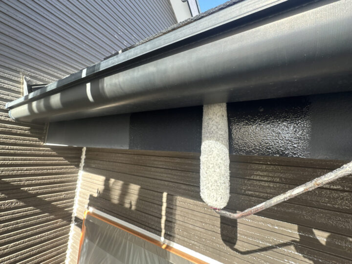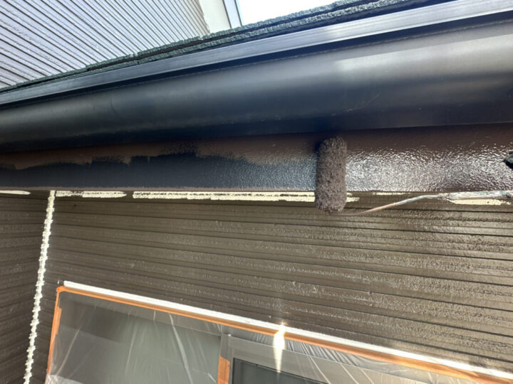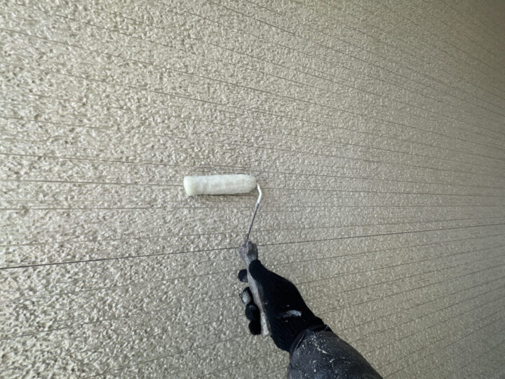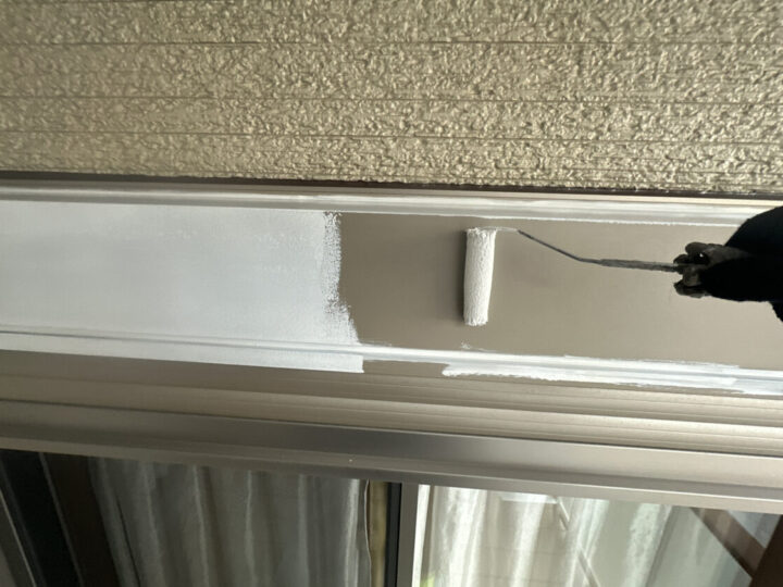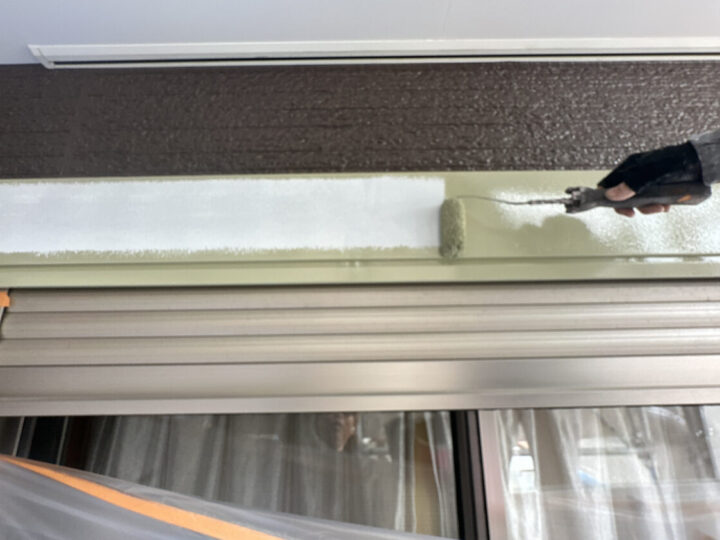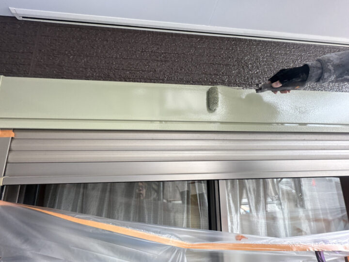 外壁塗装の上塗りは仕上げの工程です。セミフロンマイルドⅡを使用し塗り忘れやムラのないようにしっかり施工していきます。