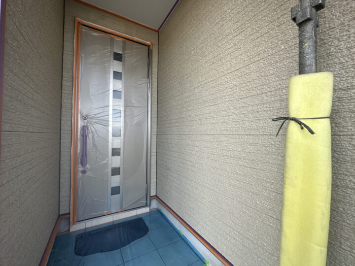塗装中は塗料が飛んでしまうので塗らない部分はシートやマスカーで覆い養生をします。
