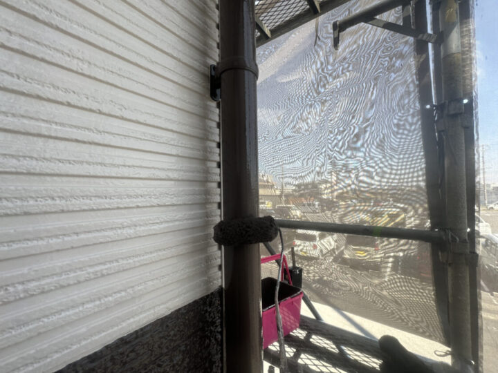 外壁塗装の中塗りはセミフロンマイルドⅡを使用し、塗膜に厚みをつけていきます。中塗りを行わないと膜厚が若干薄いので早期にチョーキングなどを起こす可能性があります。
