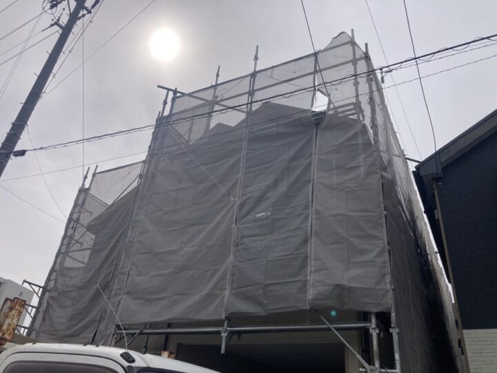 足場を架設し、メッシュシートを張っていきます。足場は作業効率UP、職人の安全確保、塗料や洗浄水の飛散防止などの役割があります。