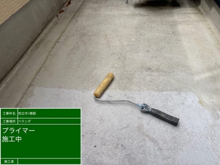 下地と防水材を強力に結びつける接着剤の役割を果たすプライマーを塗ります。塗り残しがないように全体へ均一に染み込ませていきます。