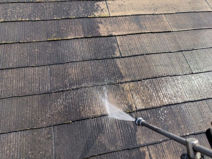高圧洗浄を行い、長年の汚れを洗い流していきます。汚れが付着したまま塗装を進めてしまうと剥がれなどの原因になってしまいますので業務用のパワーのある洗浄機でしっかり圧を掛け洗浄します。