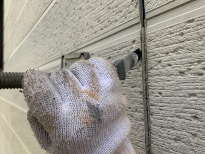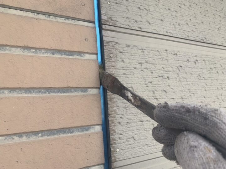 タテ目地は打ち替え工法のため、既存シーリング材をカッター等の工具で切断し、目地内部から完全に撤去します。旧シーリングが残存していると、新設シーリングの接着不良や旧材からの剥離を招く恐れがあるため、下地まで確実に除去することが重要です。