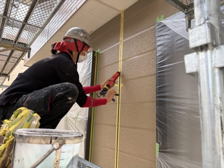 周辺部をマスキングテープにて養生した後、刷毛を用いて下地にプライマーを均一に塗布します。シーリング用プライマーの塗布は、下地とシーリング材との接着性を確保し、長期的な耐久性を左右する重要な下地処理工程です。