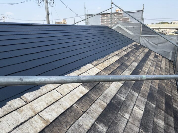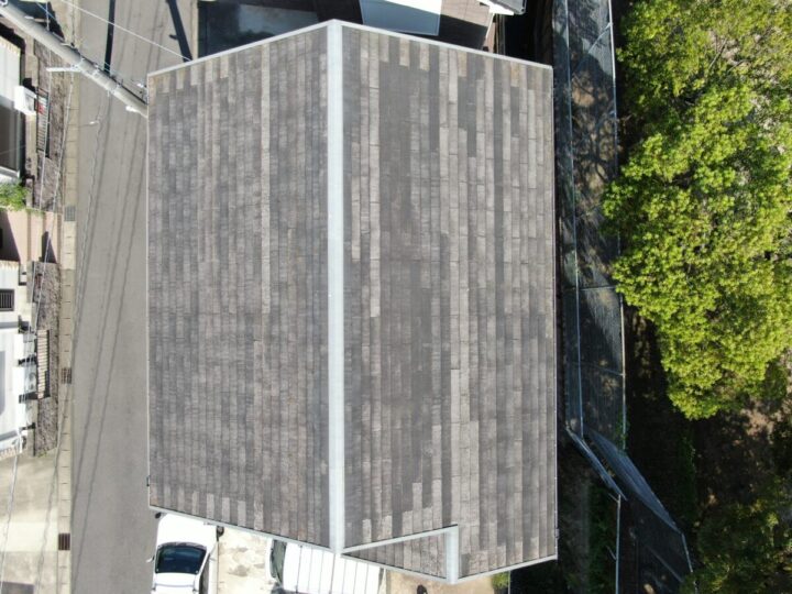 施工前の屋根の状態です。全体的に色あせが出ており、微生物の繁殖が見られます。