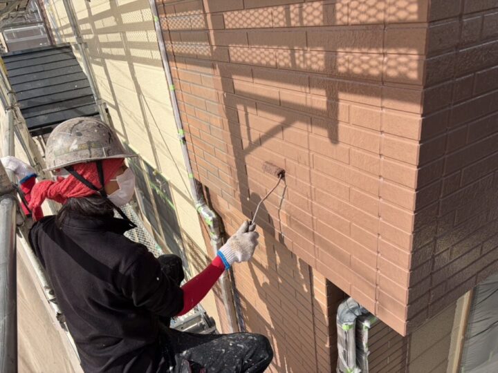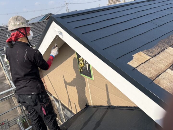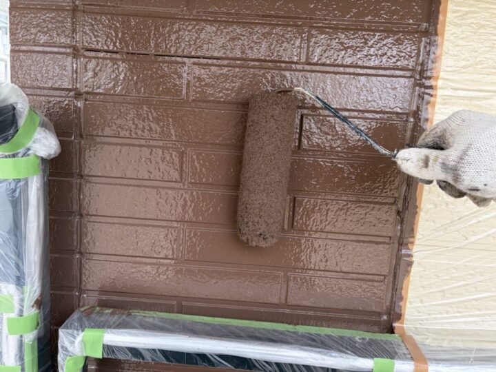 外壁の上塗り同様、塗装工程の最後に行う仕上げの塗布作業で、色ムラをなくし、美しい外観と高い耐久性を実現します。上塗りは中塗りと同じ塗料を使い、均一に塗ることで塗膜の厚みを整え、外壁をしっかり保護します。丁寧な上塗りが、長期間美しい状態を保つために重要です。