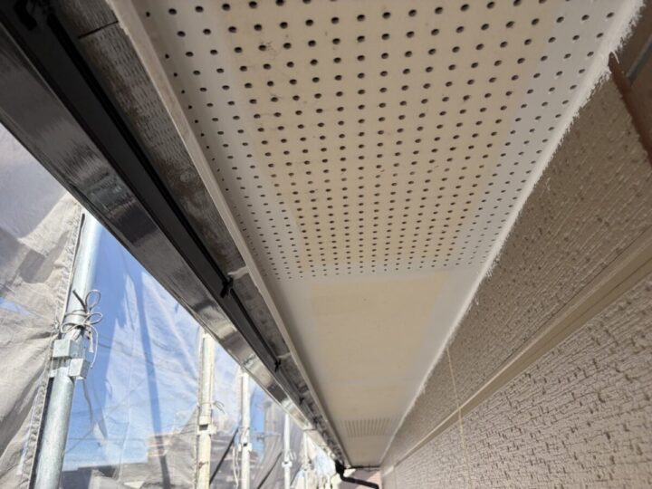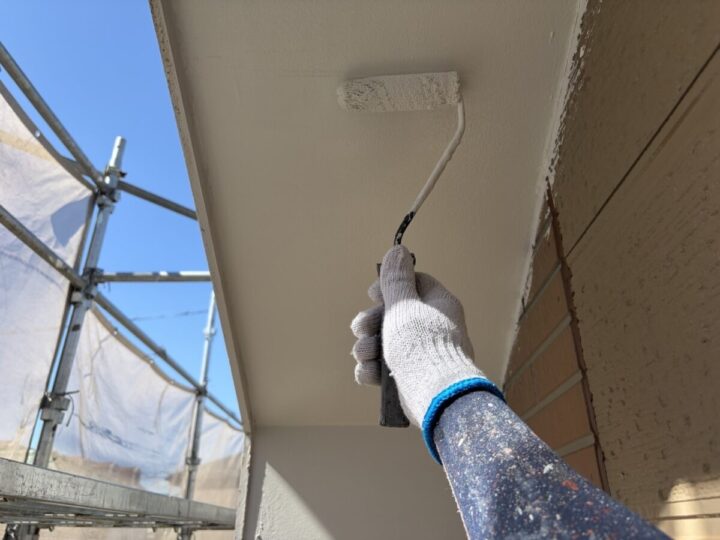 下塗りした後は、十分に乾燥させてから上塗りを行います。上塗りには軒天用のつや消し塗料などを使用し、ローラーや刷毛でムラなく均一に仕上げます。下塗りによって吸い込みが抑えられているため、上塗りがきれいにのり、耐久性と美観の良い仕上がりになります。