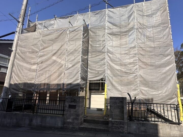 外壁塗装の足場とは、職人が安全に作業できるように建物の周囲に組む仮設の作業台です。高い場所でも安定した姿勢で作業できるため、塗りムラのない丁寧な施工が可能になります。また、足場にはメッシュシートを張り、塗料の飛散を防ぐ役割もあります。外壁塗装の品質と安全性を確保するために欠かせない設備です。